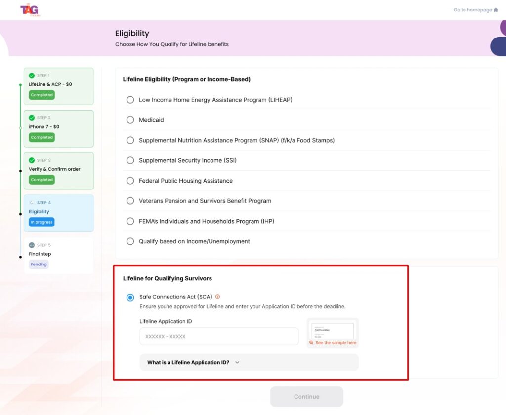 - Locate “Lifeline for Qualifying Survivors – Safe Connections Act” during program selection